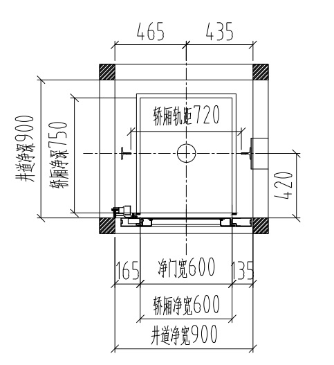 井道凈尺寸寬900mm深900mm,轎廂內(nèi)部凈尺寸寬600mm、深750mm,平開門開門寬度600mm。